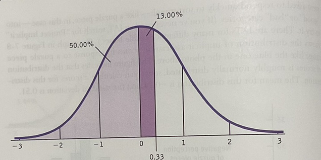 Locate 12.93% in the z table, yielding a z score = 0.33.