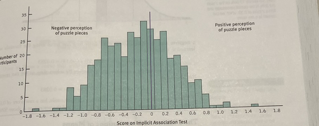 An Implicit Association Test (IAT) revealed a normal distribution of implicit association scores towards puzzle pieces, where the mean was -0.14, and the standard deviation was 0.51, indicating a negative bias across the sample.