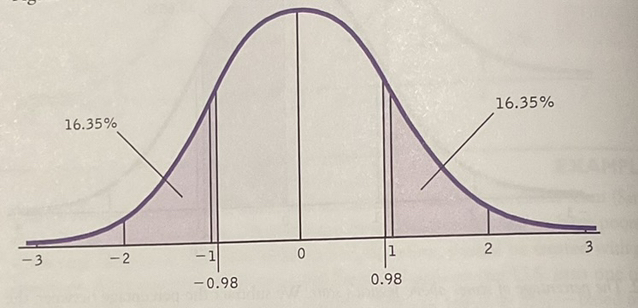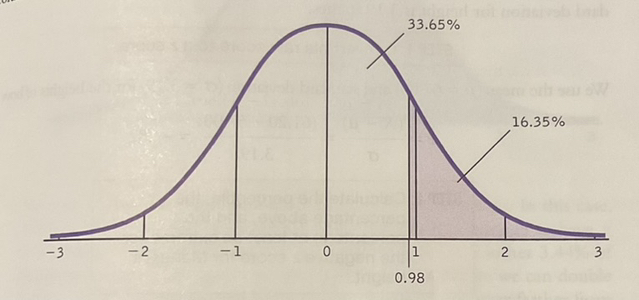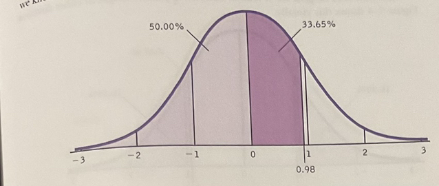 Step 2: Search for z = 0.98 in the z table, yielding a percentage of 33.65% between the mean and Jessica's z score.