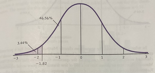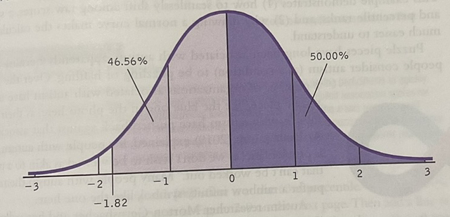 Step 2: Identify z = 1.82 in the z table, yielding 46.56% percentage between the mean and z.