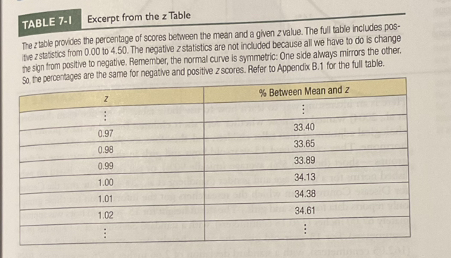 The full z table is located in Appendix B.1, with an excerpt provided in Table 7-1.