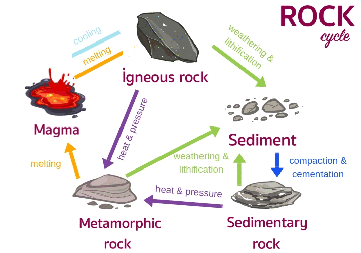 magma - igneous rock - sediments - sedimentary rocks - metamorphic rock - magma