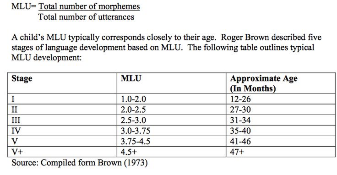 - Language sample: * determine Mean Length of Utterance (MLU) * Average number of morphemes in each utterance