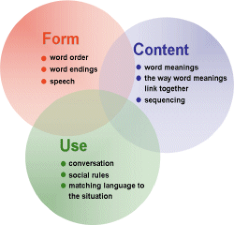 - Language * Form: structure of the language (syntax (grammar and order), morphology (morpheme - smallest part of a word… pre and suffixes), phonology (rules)) * Content: semantics (meaning of language) * Use: social aspects of language (pragmatics)