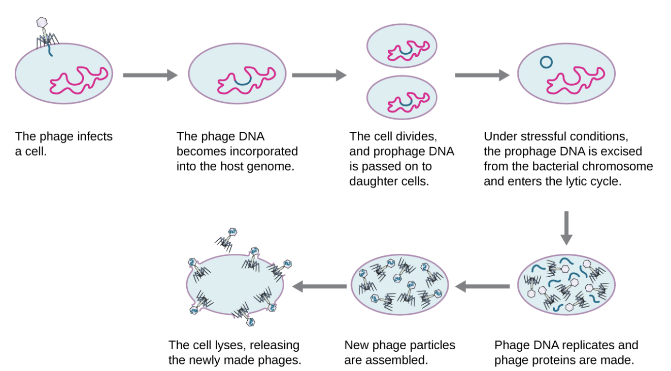 Some conditions can stimulate the prophage to go into induction, casuing the phage to excise from the genome, enter lytic cucle, and produce new phages to leave host cells.