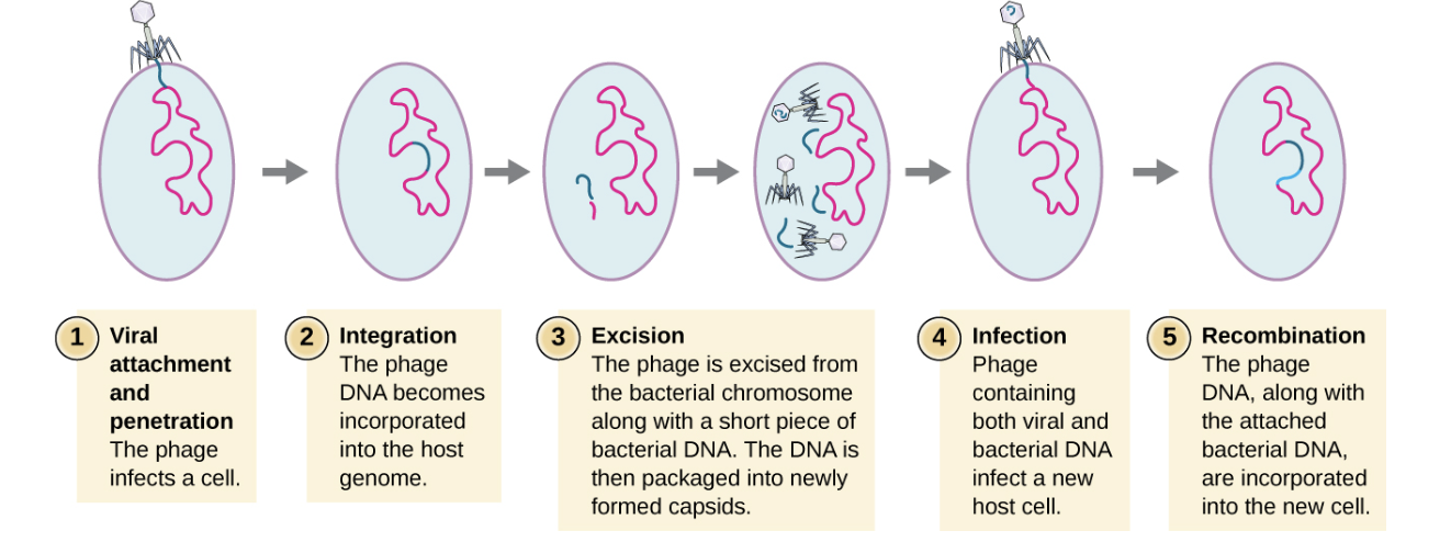 During excision from the host chromosome, a phage may occasionally remove some bacterial DNA near the site of viral integration. The phage and the host DNA from one end or both ends of the integration site are packaged w/in the capsid and are transferred to the new, infected host.
