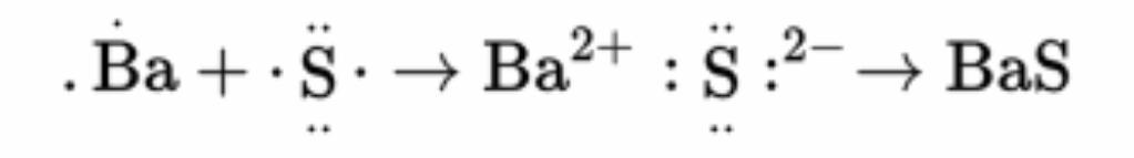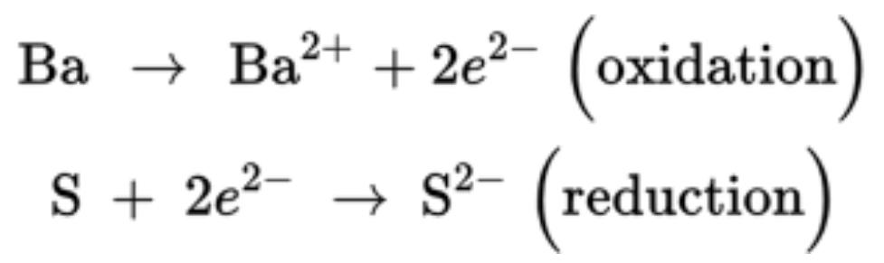 The barium loses the two valence electrons and is oxidized. The sulfur gains the electrons and is reduced.