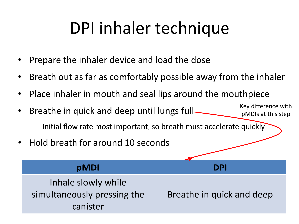 DPI= dry powder inhaler which the patient ‘sucks’ into their lungs. It is automatically breath-actuated (drug released only when the user inhales), relatively easier to use and has lower carbon footprint than pMDIs.