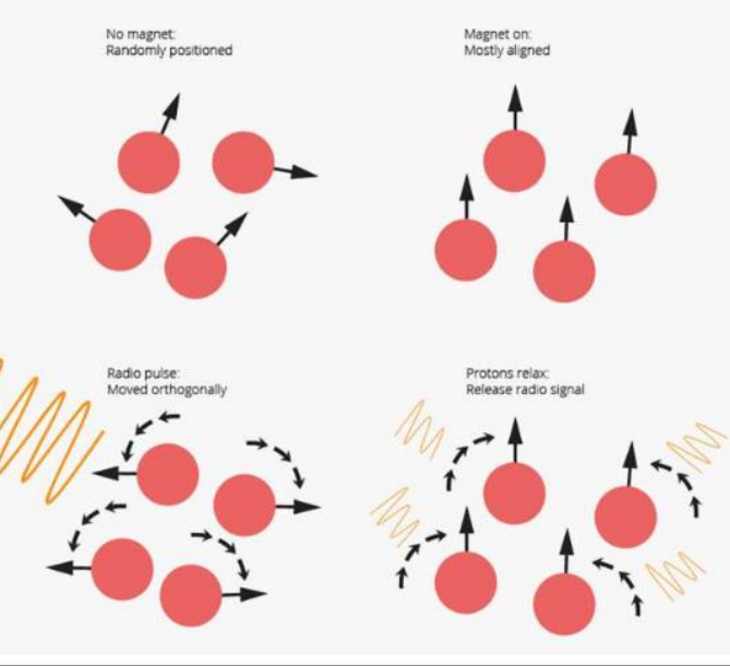MRIs employ powerful magnets which produce a strong magnetic field that forces protons in the body to align with that field. When a radiofrequency current is then pulsed through the patient, the protons are stimulated, and spin out of equilibrium, straining against the pull of the magnetic field.