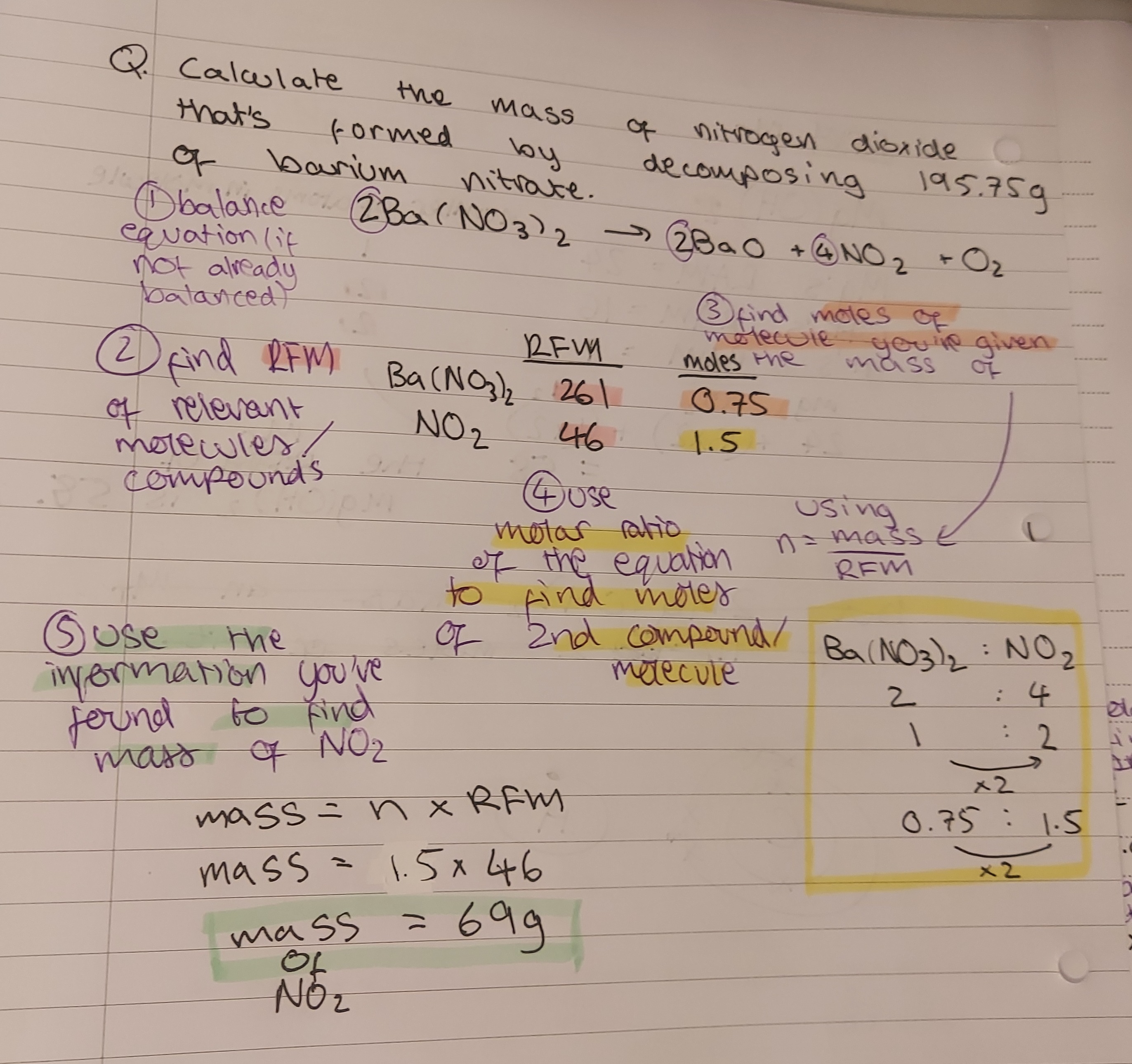 if a molecule has a large number before it, remember to multiply the entire RFM by that number. that number signifies the number of moles of the substance needed in a balanced reaction.