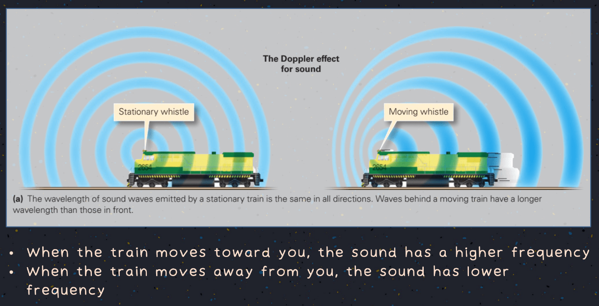 The Doppler Effect - sound at a stationary moves at equally in all the same directions while a moving train has a longer wavelength at its back and short up front.