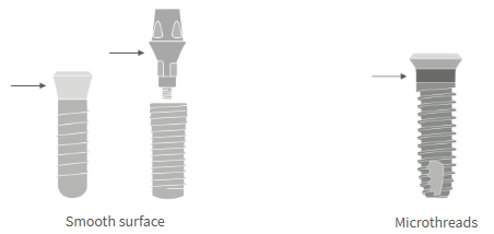 Implants may exhibit different degrees of surface roughness as well as distinct surface features.