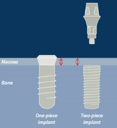 In a one-piece implant the transmucosal section is built into the implant, while in a two-piece design the transmucosal section is part of a separate abutment.
