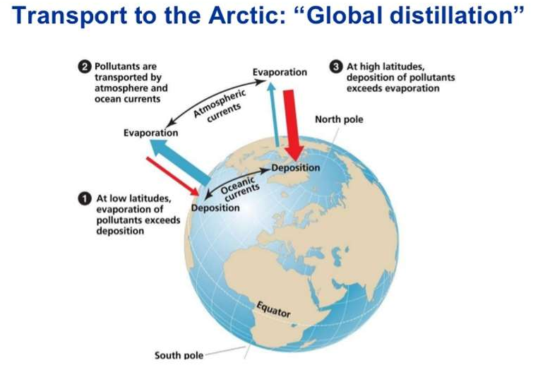 - net transfer/transport of pollution from lower latitudes (typically where it’s warmer) to high latitudes (poles, colder)