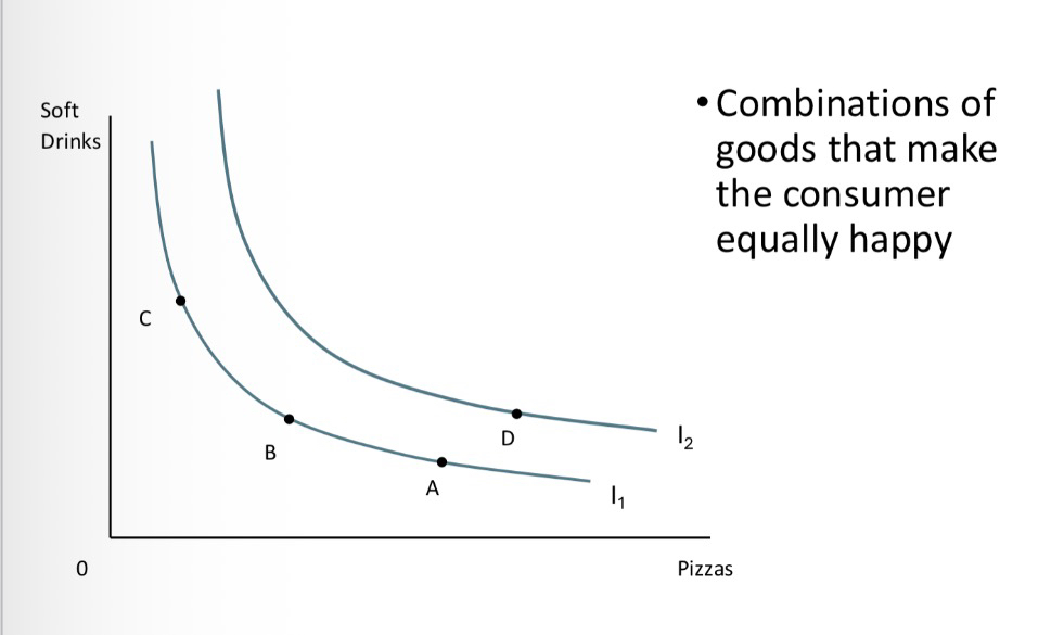Consumers can choose different combinations of the two goods and may be indifferent between certain combinations