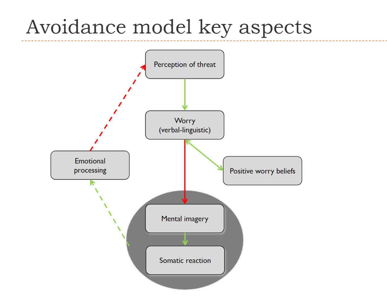 Because in anxiety, the worry is verbal-linguistic, it prevents mental imagery. Mental imagery usually causes a somatic reaction, leading to emotional processing and anxiety reduction. However, ppl with GAD instead will keep worrying, which reduces worry and develops into positive worry beliefs