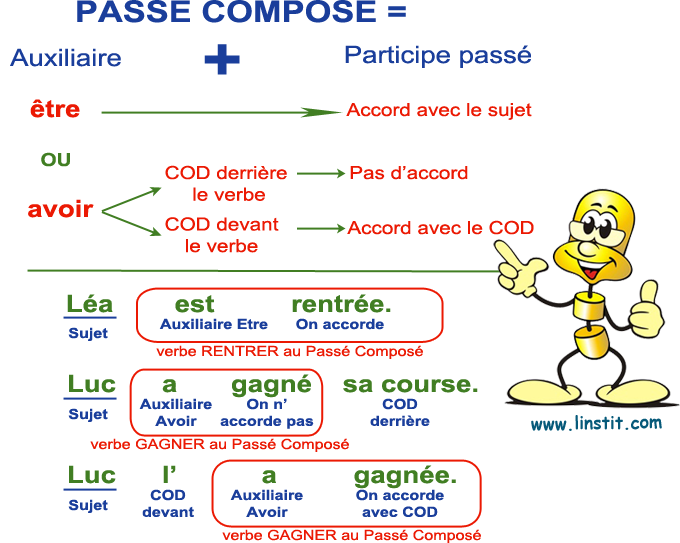 Avoir → eu, Être → été, Dire → dit, Ecrire → ecrit, Mettre → mis, Permettre → permis, Prendre → pris, Comprendre → compris, Apprendre → appris, Croire → cru, Voir → vu, Boire → bu, Devoir → dû, Pouvoir → pu, Lire → lu, Recevoir → reçu, Vivre → vécu, Vouloir → voulu, Connaître → connu, Courir → couru, Faire → fait, Rire → ri, Ouvrir → ouvert, Savoir → su, Mourir → mort, Naître → né.
