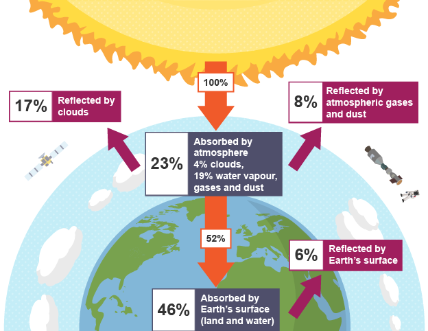 As sun’s energy travels to earth, its either absorbed, scattered, or reflected