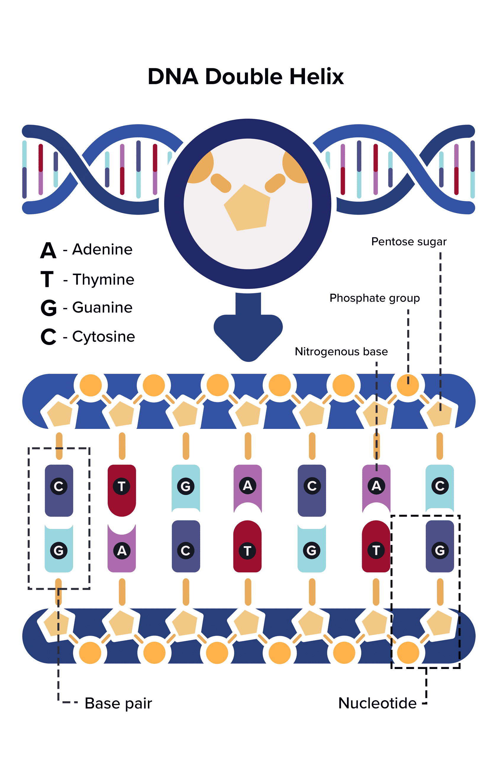 Deoxyribonucleic acid, DNA, is a negatively charged molecule found in the cells of all living things. Animals, plants, fungi, protists, and bacteria all have DNA. Even some viruses, which are nonliving, have DNA. DNA’s chemical code provides the instructions to build proteins(opens in a new tab); large molecules that are essential for life. DNA lays the foundation for how an organism grows, what they look like, their predisposition for disease, and so much more. DNA is inherited, meaning it is passed down from biological relatives. This is why families often share many physical characteristics.