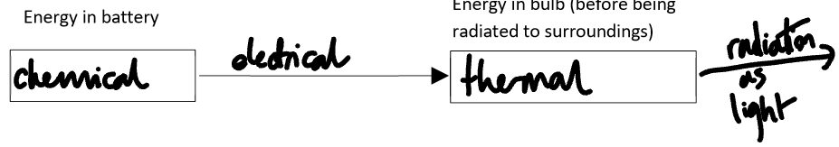 Energy transfer can be shown using flow diagrams. Each box shows an energy store, and each arrow shows the type of transfer between stores. If there are multiple steps, show them in order.