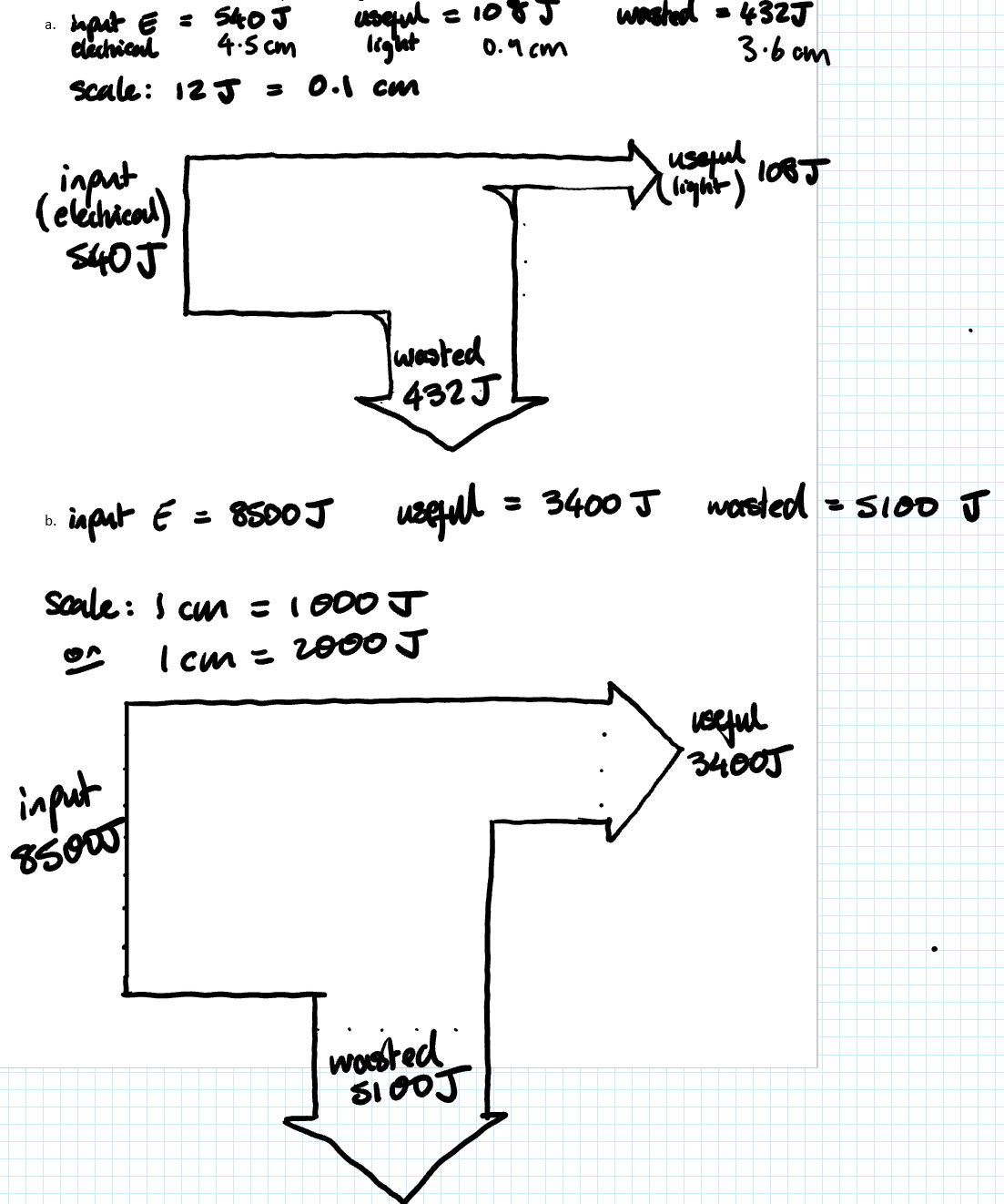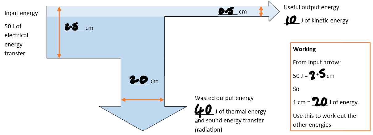 Arrows are drawn to scale, so measuring their width allows you to calculate the energy in each store or transfer.