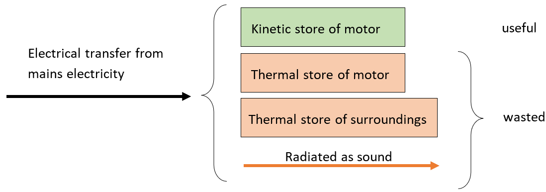 However, most of the energy is lost due to friction and is transferred to the thermal stores of the motor and its surroundings.