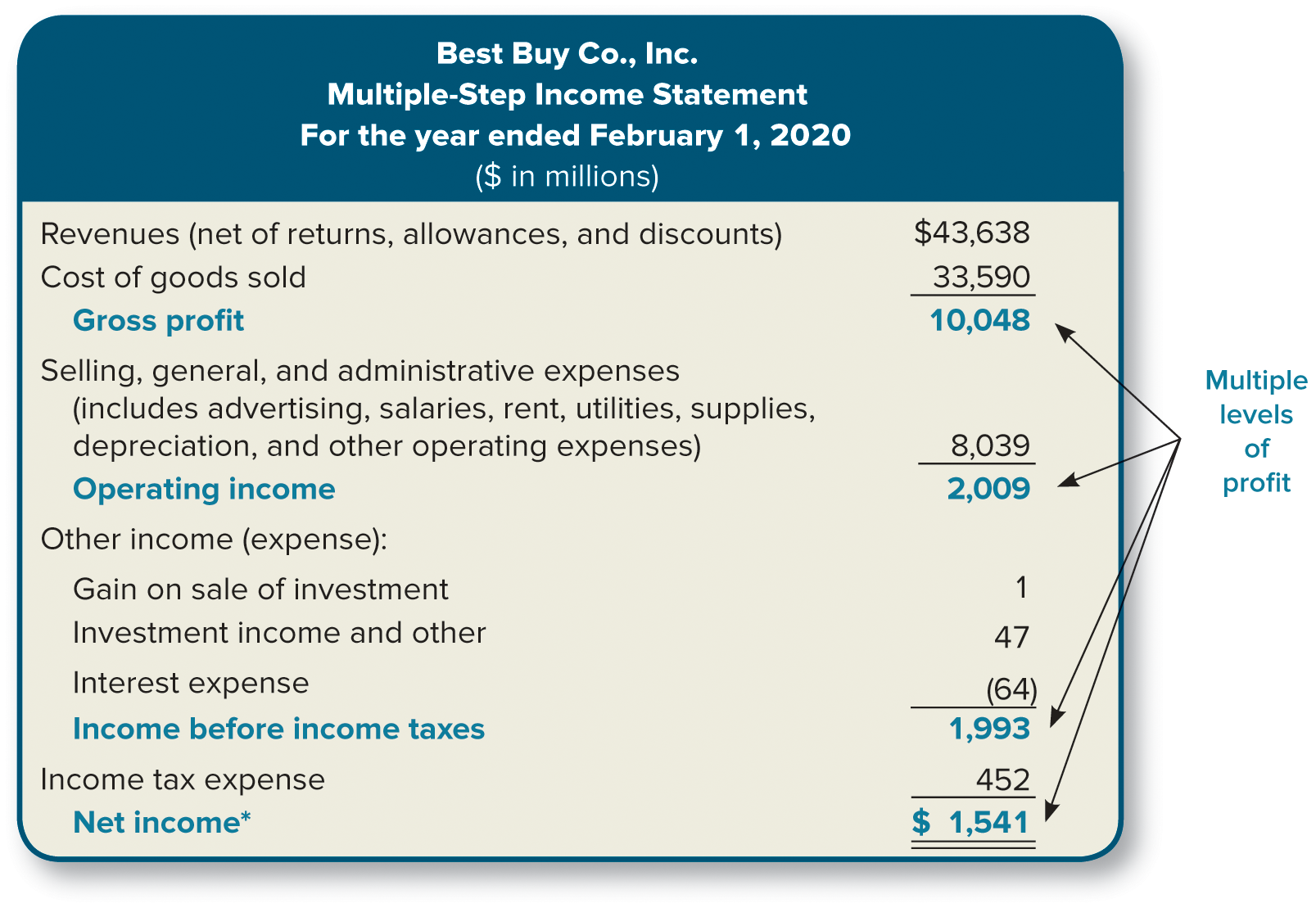 multiple-step income statement - an income statement that reports multiple levels of income (or profitability)