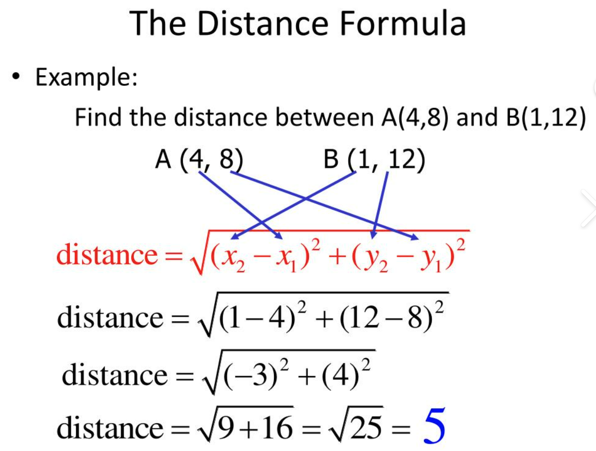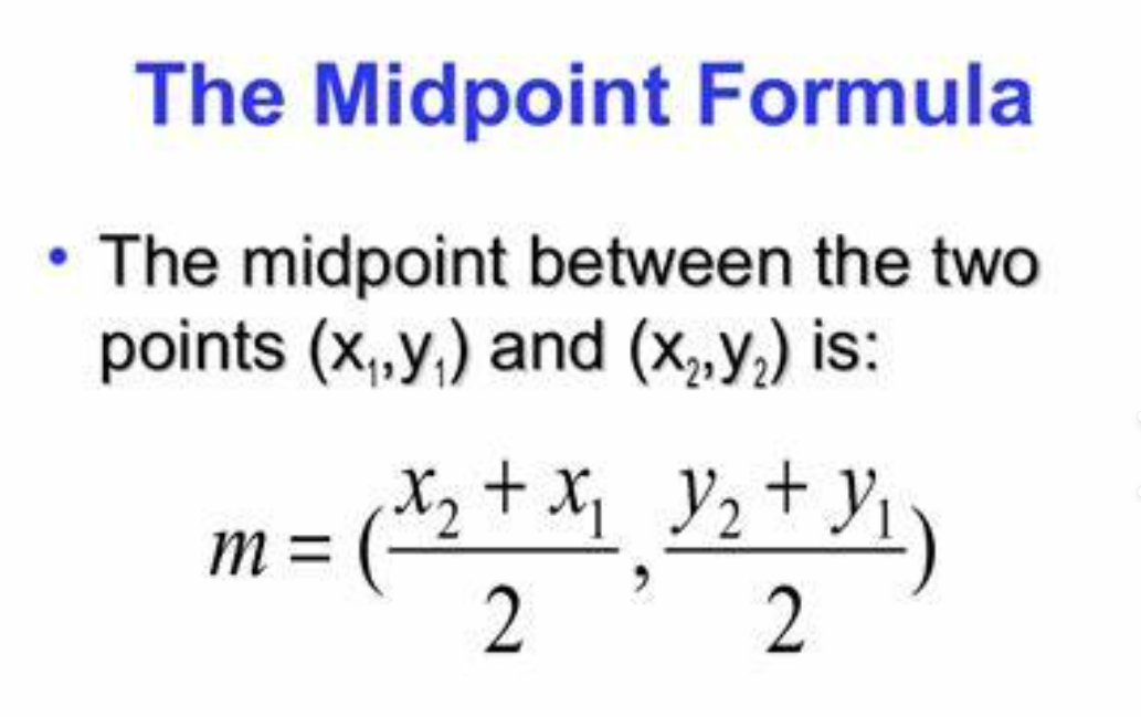 The Midpoint Formula : m= ((x2+x1)/2,(y2+y1/2))