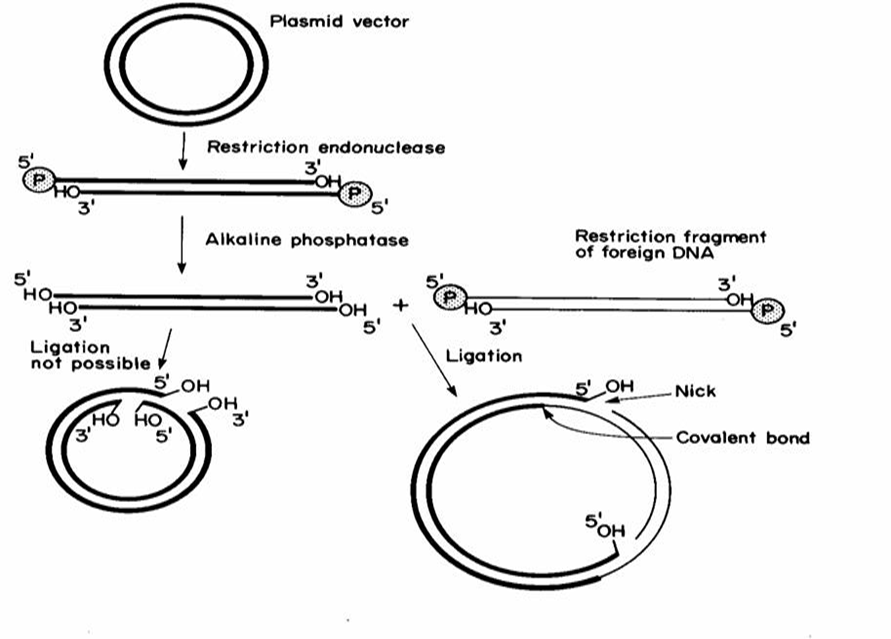 Alkaline Phosphatase: Enzyme that chemically modifies DNA by removing the 5’ phosphate group; a dephosphorylated vector cannot ligate to itself, ensuring only the target fragments can join.