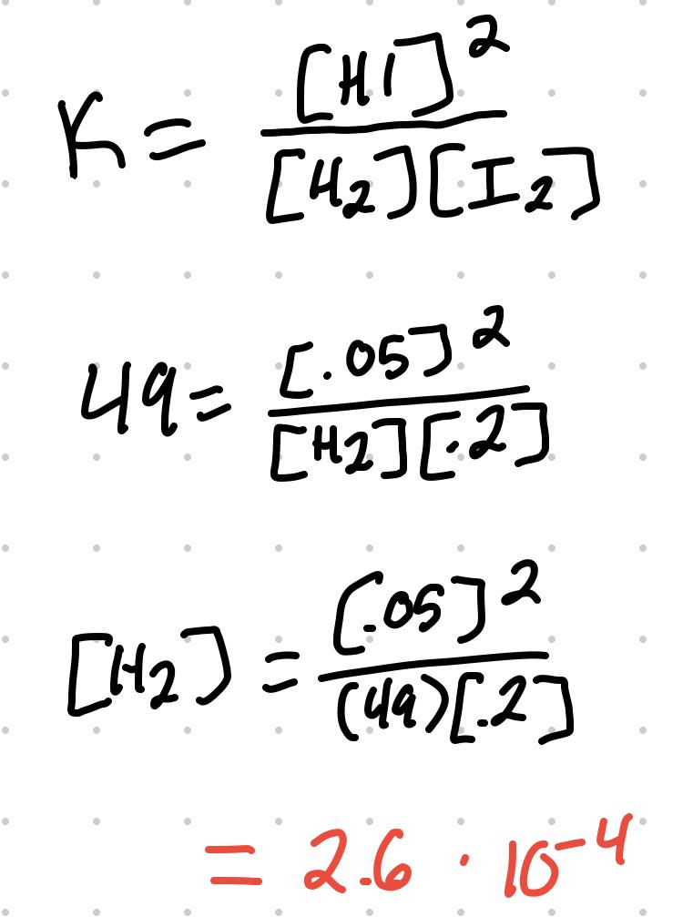 For the reaction H2 + I2 ⇄ 2 HI, where K = 49, [I2] = .2M, [HI] = .05M, [H2] can be calculated: