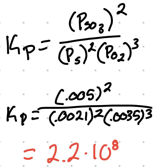 For the reaction 2S + 3O2 ⇄ 2SO3 where the partial pressure are S = .0035atm, O2 = .0021atm, and SO3 = .005atm, what’s the Kp?