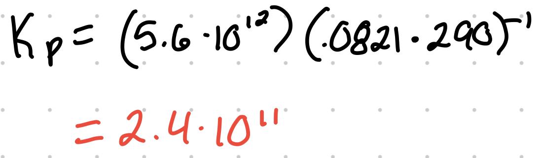 For the reaction 2NO (g) + O2 (g) ⇄ 2 NO2 (g) where the Kc is 5.6x10^12 at 290K, what’s the Kp?