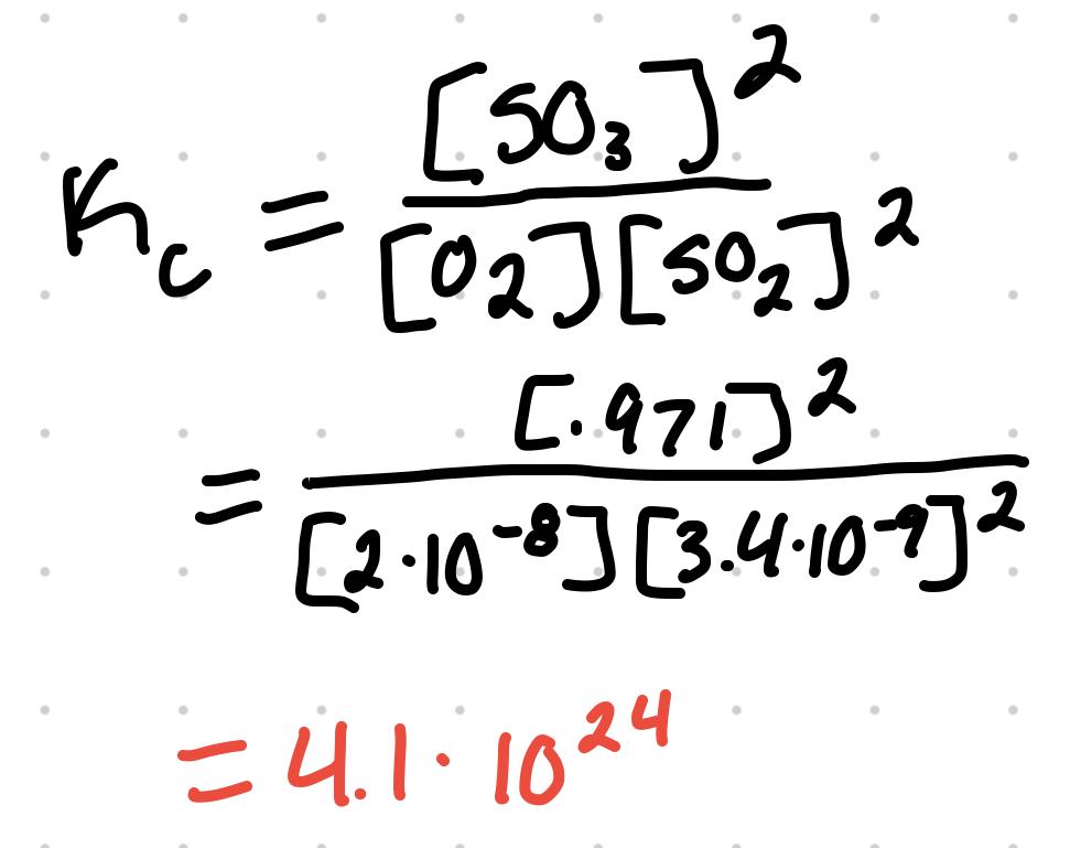 For O2 + 2SO2 ⇄ 2SO3 where the equilibrium concentration are [O2] = 2x10^-8 M, [SO2] = 3.4x10^-9 M, and [SO3] = .971 M