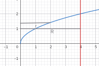 First, we find what our R would be. This would be just our Top - Bottom →R=\sqrt{x}-0=\sqrt{x}