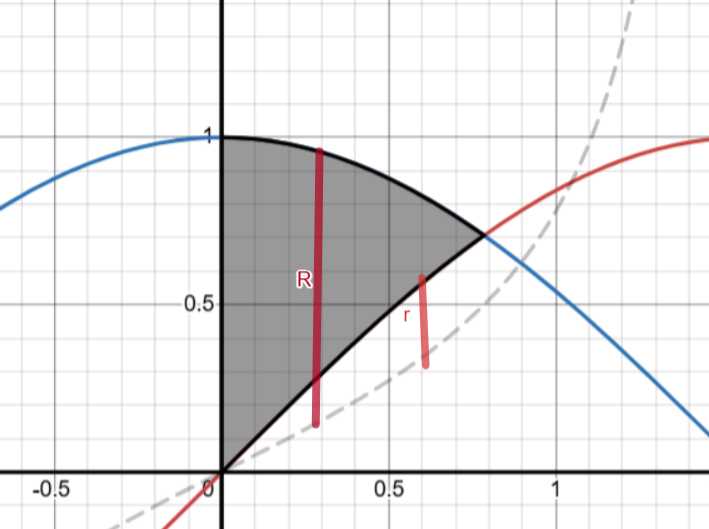 This is a washer problem. Since we’re rotating horizontally, we’ll be in terms of x. We need to find our limits, which would be x = 0 until pi/4. We need to find our big R and little r → R=\cos x-\frac12\tan x\\r=\sin x-\frac12\tan x