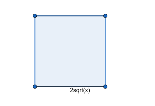 Then, we need to find the area of this cross section, as its base would be the area between the original functions. Since this is in terms of x, we have the Top - Bottom, so the length of our base would be \sqrt{x}--\sqrt{x}=2\sqrt{x} . Now, we find our area of our square → A_{square}=\left(2\sqrt{x}\right)^2
