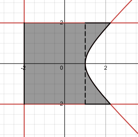 This will be horizontal, so we’re going to be working in terms of y. Since we have the limits as actual equations, and they are all y-values, we don’t have to do any converting!