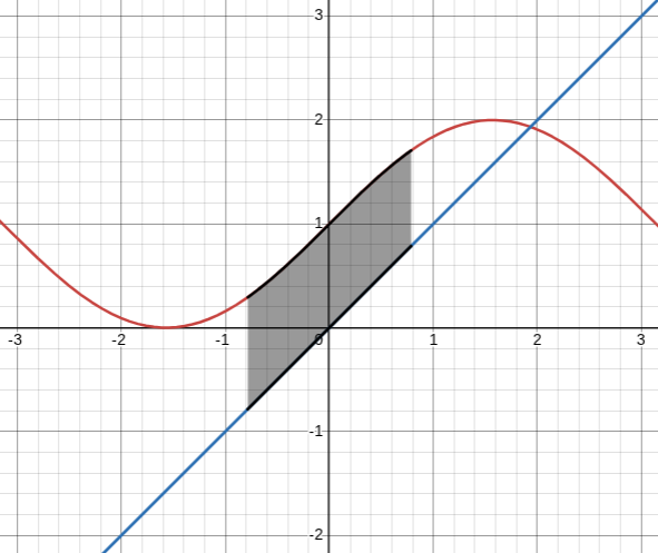 We set up our integral → A=\int_{-\frac{\pi}{4}}^{\frac{\pi}{4}}\left\lbrack\left(\sin x+1\right)-x\right\rbrack dx