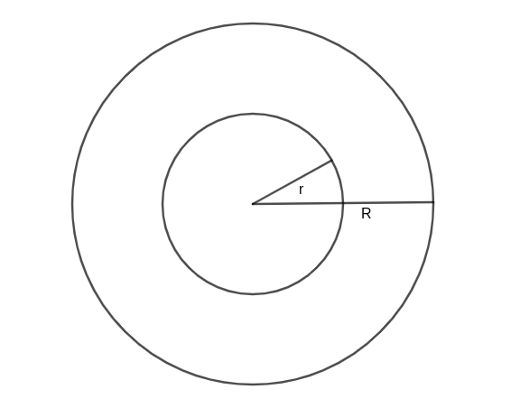 The area for this shape would be \pi R^2-\pi r^2=\pi\left(R^2-r^2\right). When we integrate, we get this formula for the washer method → V=\pi\int_{a}^{b}\left\lbrack R^2-r^2\right\rbrack dx