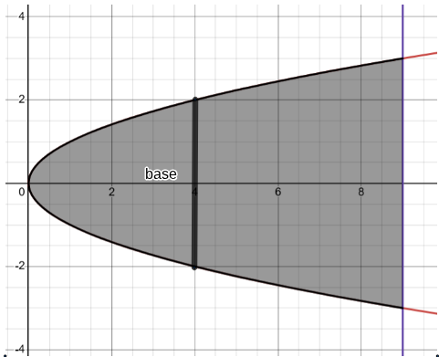 Let R be the region bounded by x=y² and x=9. Find the volume of the solid that has R as its base whose cross sections are perpendicular to the x-axis (this means we’ll be working in terms of x).