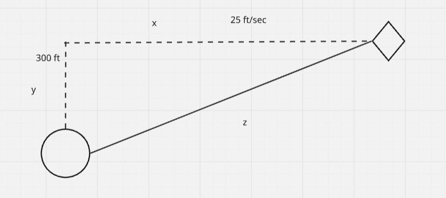 Now for our equation, Pythagoreans Theorem → x^2+300^2=z^2\Rightarrow2x\frac{dx}{dt}=2z\frac{dz}{dt}