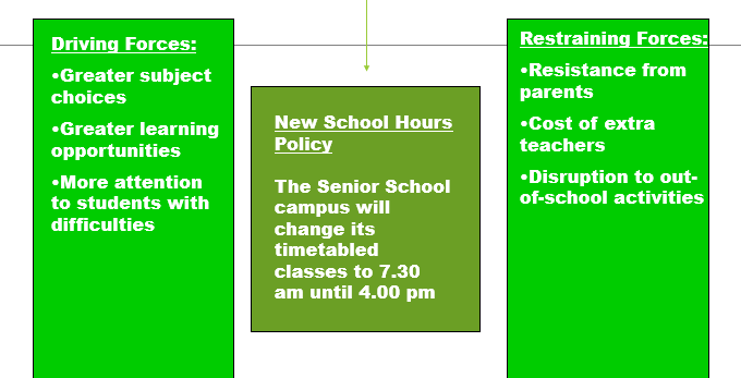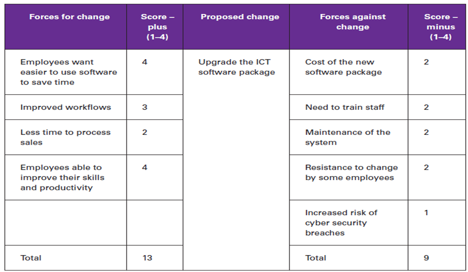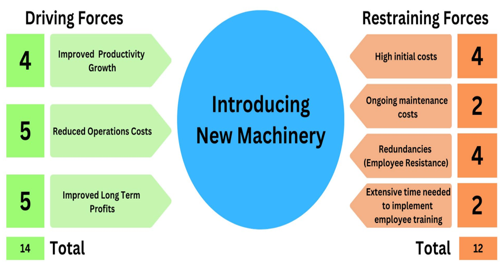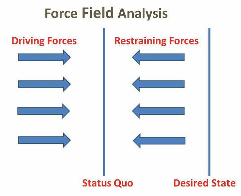 - Identifies driving forces (promoting change) and restraining forces (resisting change).