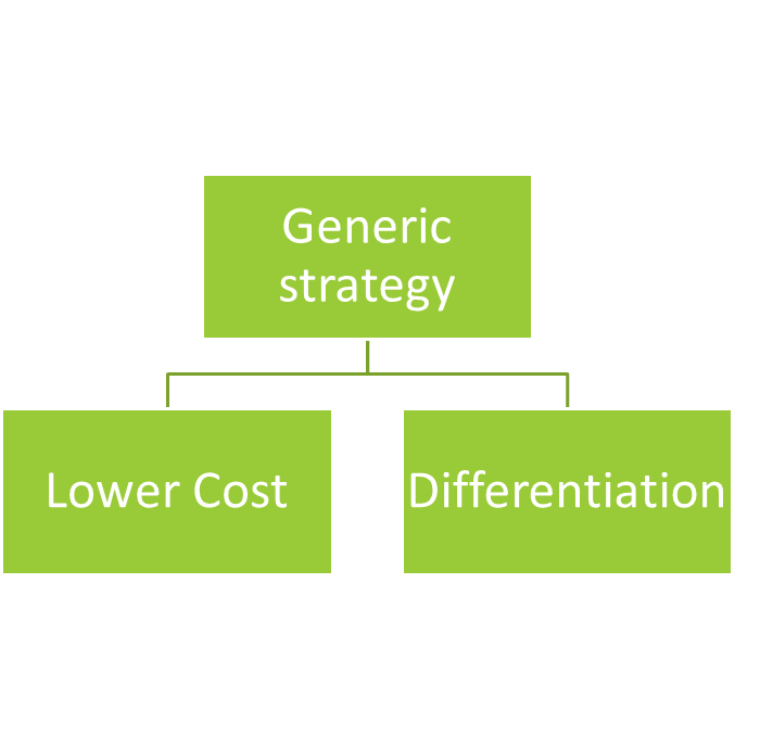 - Porter called the generic strategies “Lower Cost" (no frills) and "Differentiation" (creating uniquely desirable products and services).