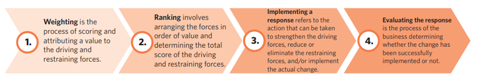 - Weighting process involves scoring and attributing values to driving and restraining forces.