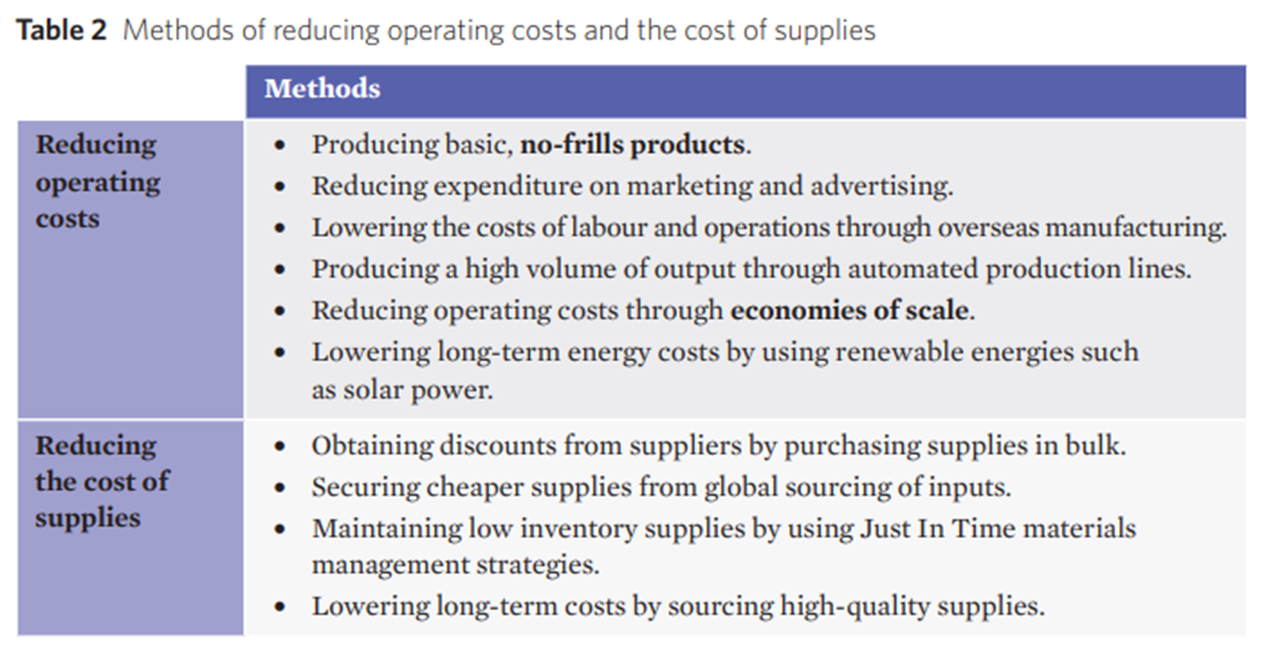- Aims to gain competitive advantage by minimising product and service delivery costs.