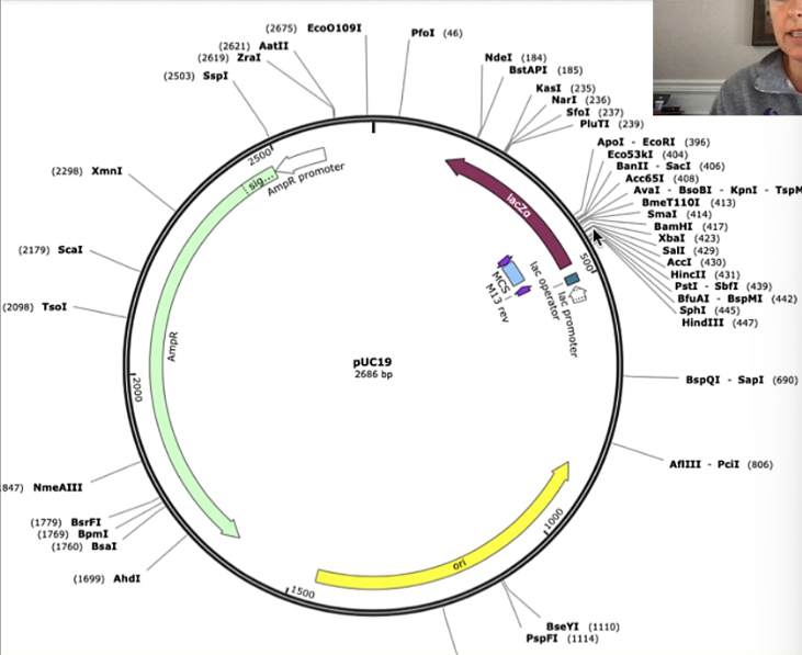 plasmid map: identifies the key features in the plasmid, as well as a number of restriction enzyme sites