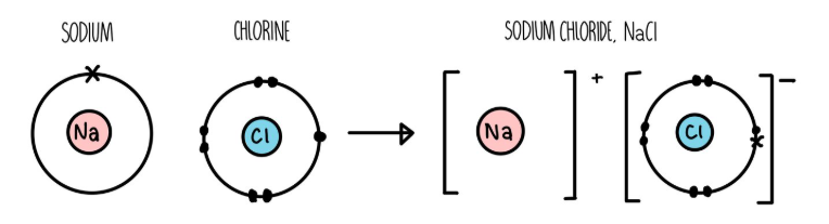 metal + non-metal: electrons in the outer shell of the metal atom are transferred