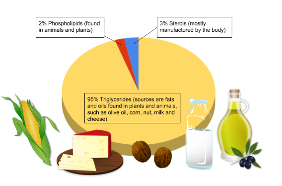 More than 95% of lipids in the diet are in the triglyceride form and some have a visible presence (butter and vegetable oil) and some are hidden in foods (aked goods, dairy products like milk and cheese, and fried foods.)
