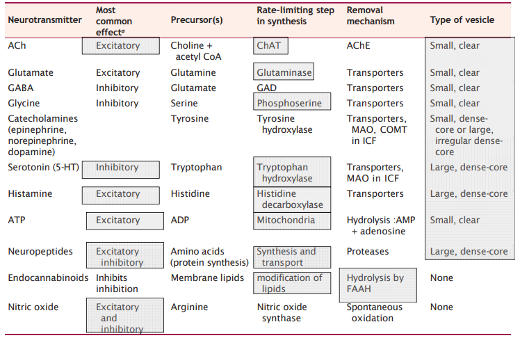 Small-molecule neurotransmitter: Have rapid effects ionotropically, though biogenic amines are a type that are slower with metabotropic receptors and GPCRs. Made in presynaptic terminals, packaged in vesicles by vesicular transport. Made in presynaptic terminals