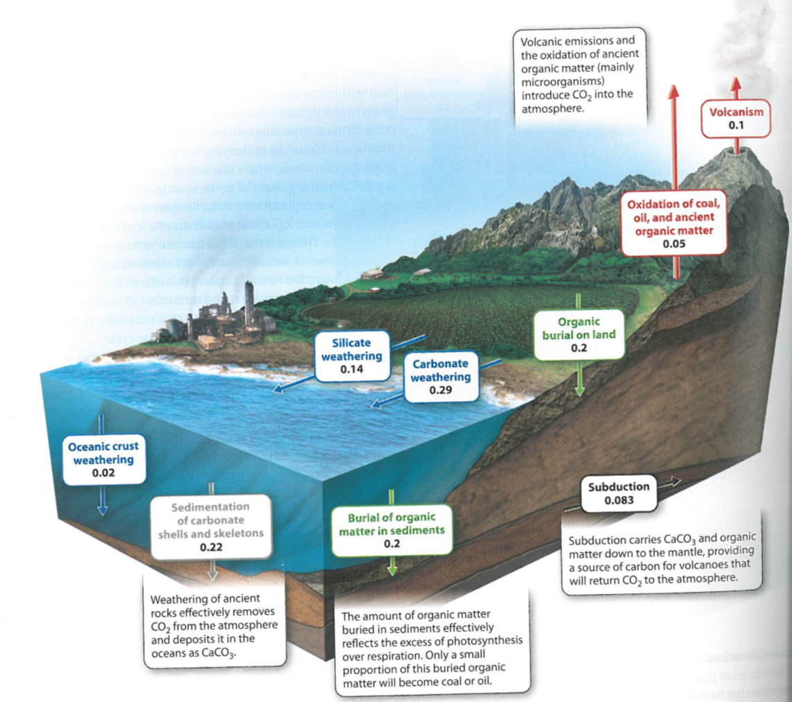 Volcanism and oxidation of ancient organic matter introduce CO2 into the atmosphere.